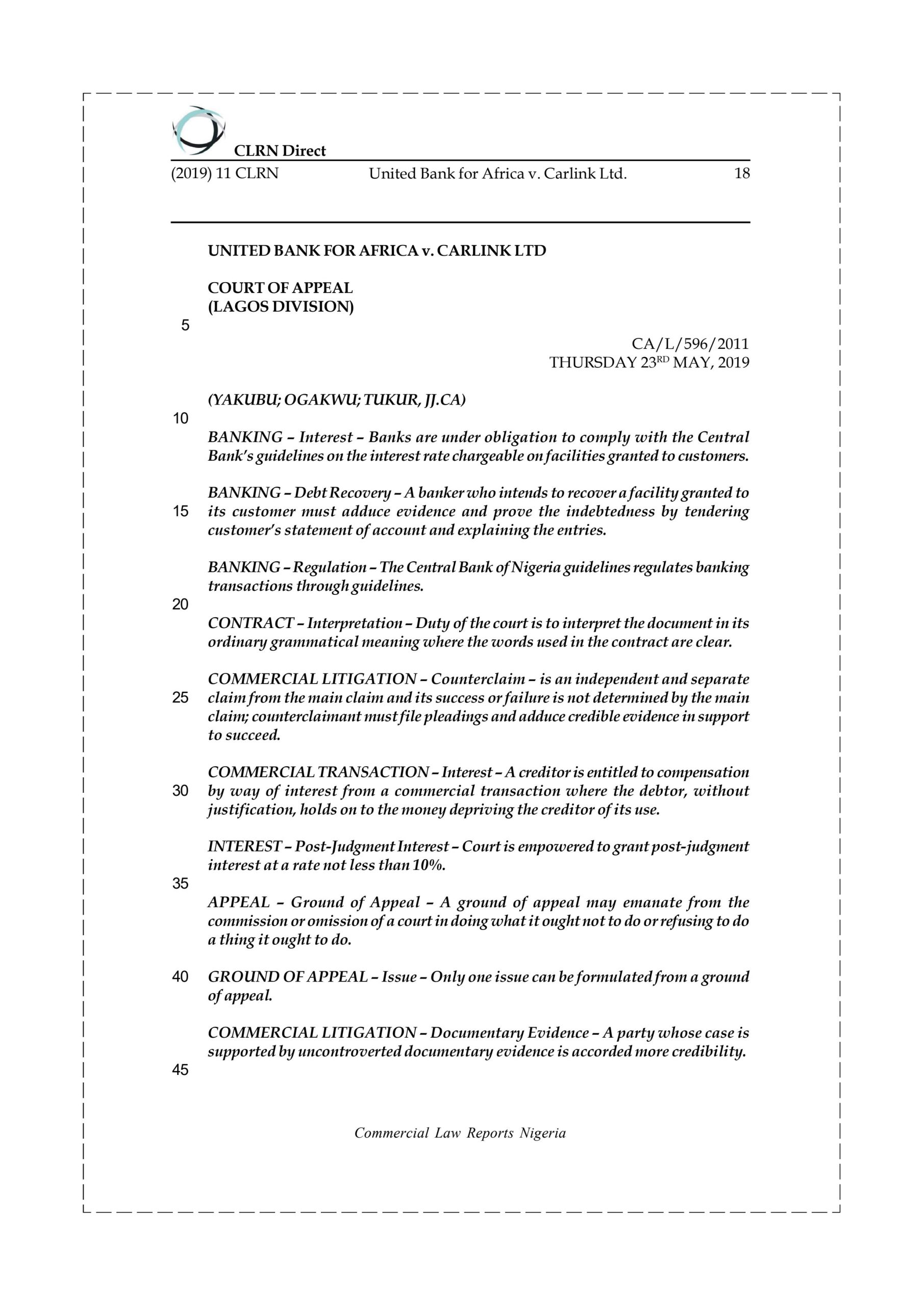 The respondent made repeated demands for a refund but the appellant refused to accede to its request. In order to recover the money, the respondent filed a suit against the appellant at the High Court of Lagos State. The parties filed their pleadings and the appellant incorporated a counterclaim in its defence. The matter went to trial and at the end of proceedings, the court delivered judgment in favour of the respondent and dismissed the counterclaim of the appellant. However, the court did not make any pronouncement on the relief sought by the respondent relating to the 100% penalty to be paid on the excess charges as directed by the Central Bank of Nigeria (CBN), in its guidelines. The appellant was dissatisfied with the decision of the trial court and filed a notice of appeal at the Court of Appeal, Lagos Division. The respondent was also dissatisfied with the aspect of the judgment relating to its relief not addressed and consequently, filed a cross appeal.
