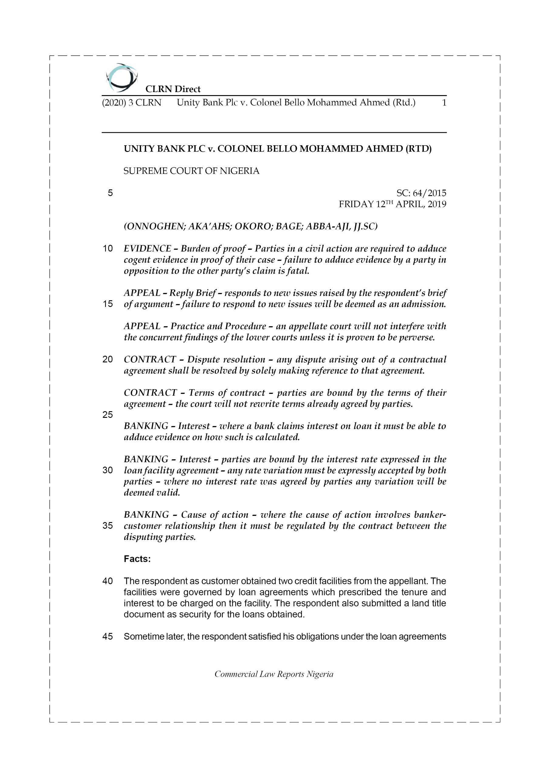 Aggrieved, the respondent filed an action at the High Court against the appellant claiming two declarations and five orders. The principal claim of the respondent as plaintiff was for an order directing the appellant as defendant to release to the respondent its title document. The trial court gave judgment in favour of the respondent.