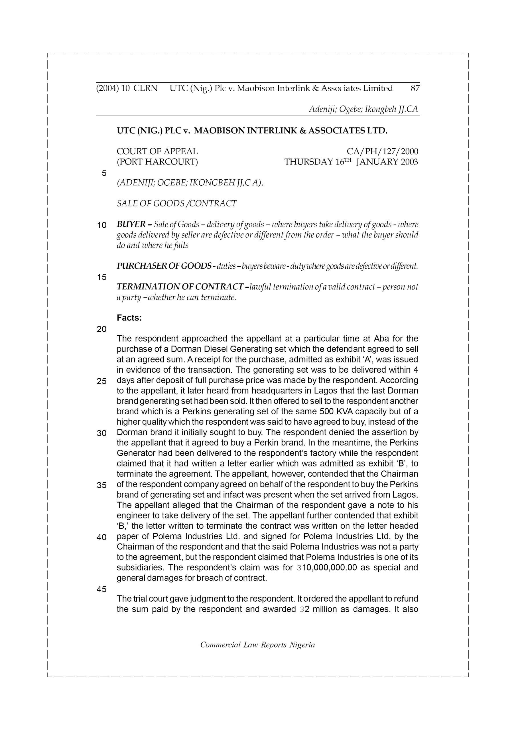 UTC (Nig) Plc v. Maobison Interlink & Associates Ltd