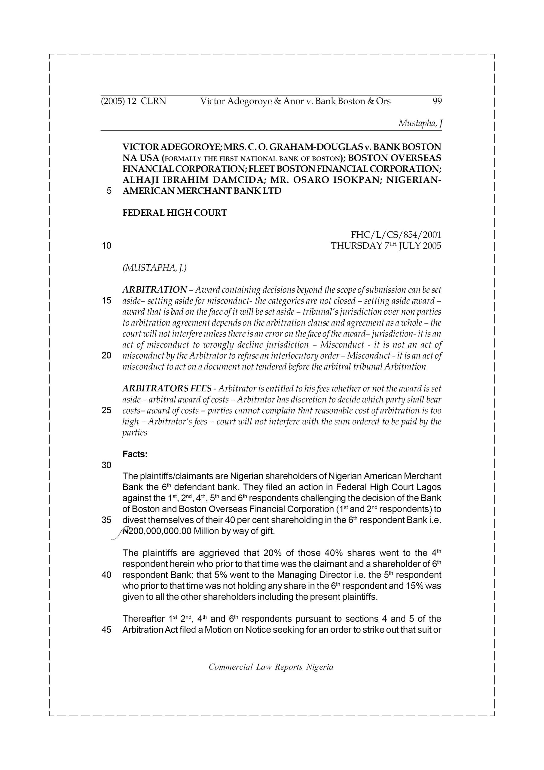 The plaintiffs/claimants are Nigerian shareholders of Nigerian American Merchant Bank the 6th defendant bank. They filed an action in Federal High Court Lagos against the 1st, 2nd, 4th, 5th and 6th respondents challenging the decision of the Bank of Boston and Boston Overseas Financial Corporation (1st and 2nd respondents) to divest themselves of their 40 per cent shareholding in the 6th respondent Bank i.e. N200,000,000.00 Million by way of gift.