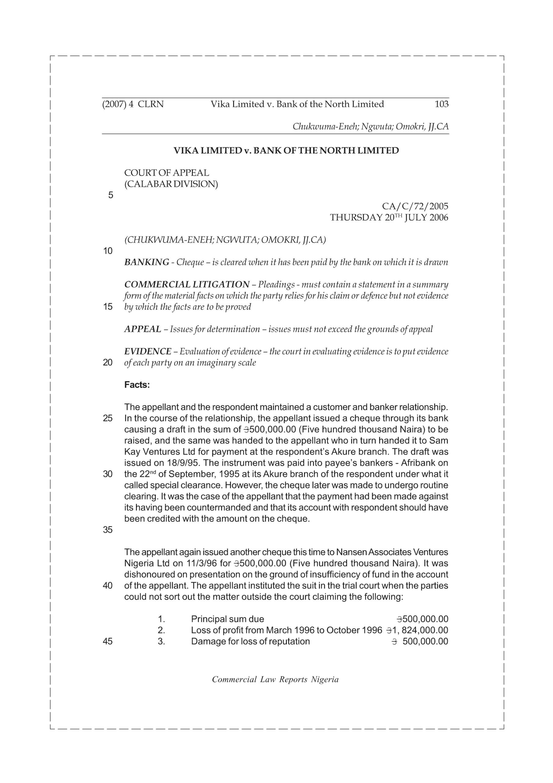 The appellant and the respondent maintained a customer and banker relationship. In the course of the relationship, the appellant issued a cheque through its bank causing a draft in the sum of N500,000.00 (Five hundred thousand Naira) to be raised, and the same was handed to the appellant who in turn handed it to Sam Kay Ventures Ltd for payment at the respondent’s Akure branch. The draft was issued on 18/9/95. The instrument was paid into payee’s bankers – Afribank on the 22nd of September, 1995 at its Akure branch of the respondent under what it called special clearance. However, the cheque later was made to undergo routine clearing. It was the case of the appellant that the payment had been made against its having been countermanded and that its account with respondent should have been credited with the amount on the cheque.