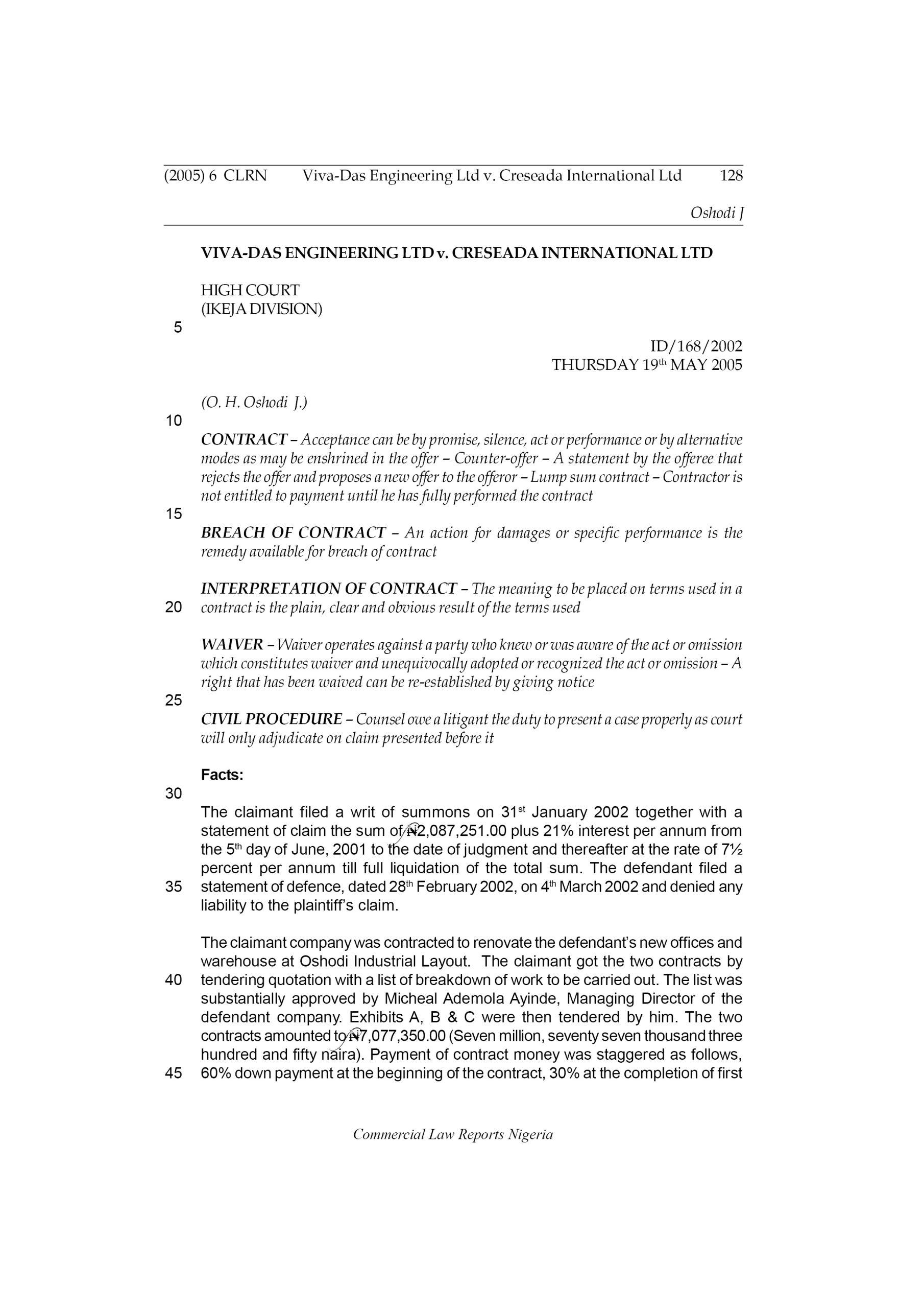 The claimant company was contracted to renovate the defendant’s new offices and warehouse at Oshodi Industrial Layout. The claimant got the two contracts by tendering quotation with a list of breakdown of work to be carried out. The list was substantially approved by Micheal Ademola Ayinde, Managing Director of the defendant company.