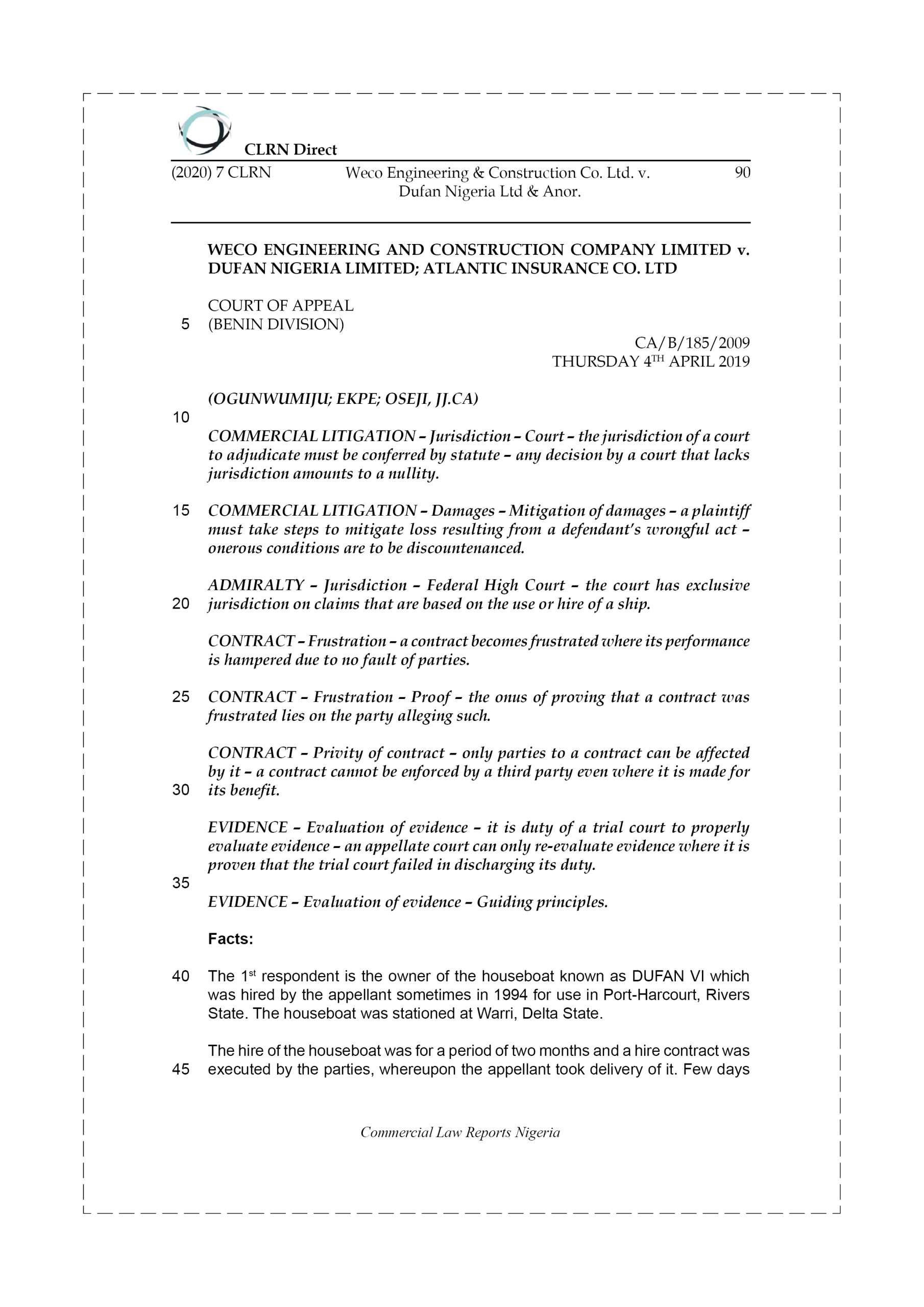 The 1st respondent is the owner of the houseboat known as DUFAN VI which was hired by the appellant sometimes in 1994 for use in Port-Harcourt, Rivers State. The houseboat was stationed at Warri, Delta State.