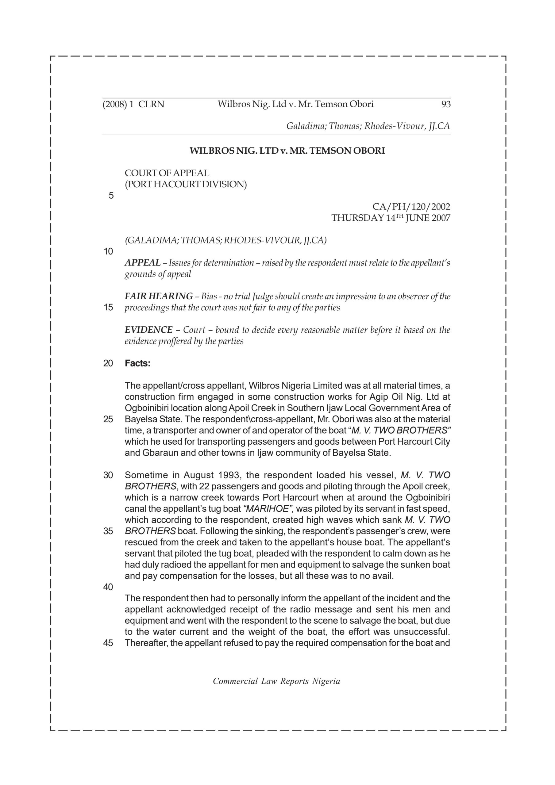 The appellant/cross appellant, Wilbros Nigeria Limited was at all material times, a construction firm engaged in some construction works for Agip Oil Nig. Ltd at Ogboinibiri location along Apoil Creek in Southern Ijaw Local Government Area of Bayelsa State. The respondent\cross-appellant, Mr. Obori was also at the material time, a transporter and owner of and operator of the boat “M. V. TWO BROTHERS” which he used for transporting passengers and goods between Port Harcourt City and Gbaraun and other towns in Ijaw community of Bayelsa State
