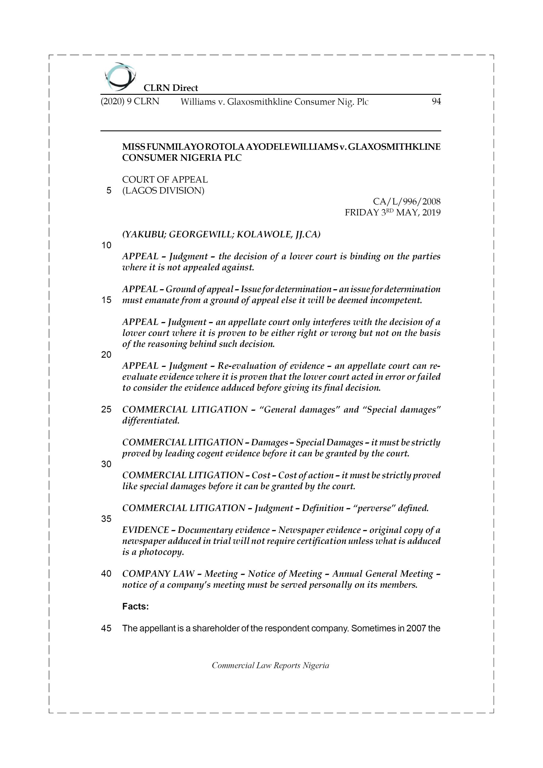 The appellant is a shareholder of the respondent company. Sometimes in 2007 the respondent held its thirty-sixth Annual General Meeting (AGM) at Muson Centre, Lagos, however, notice of the AGM was not posted to the appellant until eight days after the AGM. Aggrieved by the action of the respondent, the appellant wrote a letter to them expressing her displeasure and disappointment as she was denied her right to attend the AGM being a shareholder of the company. In response, the respondent wrote series of letters admitting the late delivery of the notice of the AGM but attributed the delay to accidental omission by the courier company. Dissatisfied with the response of the respondent, the appellant filed an action before the lower Court by way of Originating Summons seeking for the following reliefs: