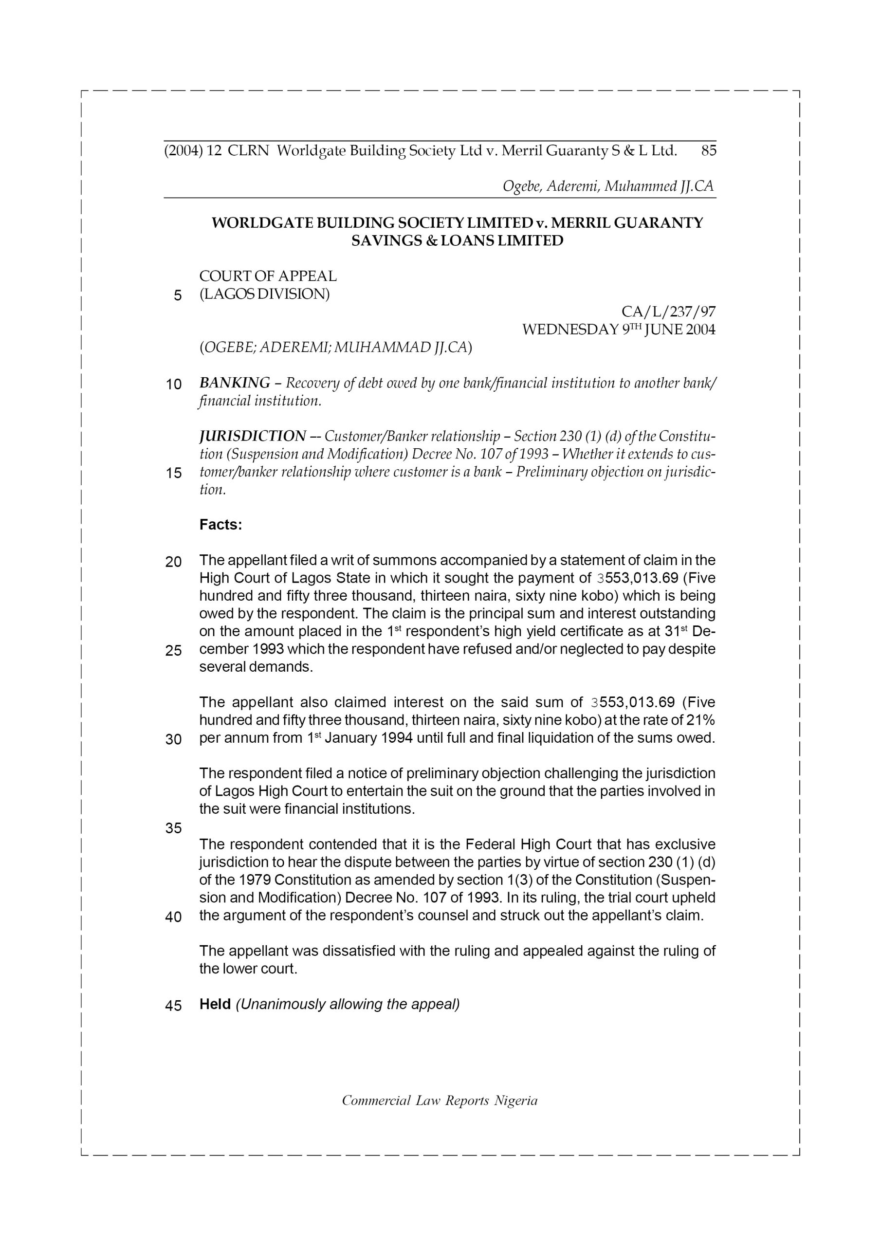 The respondent filed a notice of preliminary objection challenging the jurisdiction of Lagos High Court to entertain the suit on the ground that the parties involved in the suit were financial institutions.