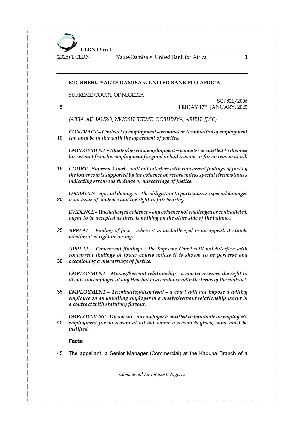 Aggrieved, the appellant sued the bank at the High Court of Kaduna State, seeking a declaration that his dismissal was unlawful, reinstatement, payment of outstanding salaries and promotion, and, alternatively, special and aggravated damages. He claimed that his dismissal violated his right to fair hearing and did not comply with the bank’s Senior Staff Conditions of Service. He did not, however, particularize or prove the damages. The respondent counter-claimed N1,588,336.65 as an outstanding debt owed by the appellant, supported by a letter dated 2 October 1997. The appellant did not challenge or disprove this evidence.