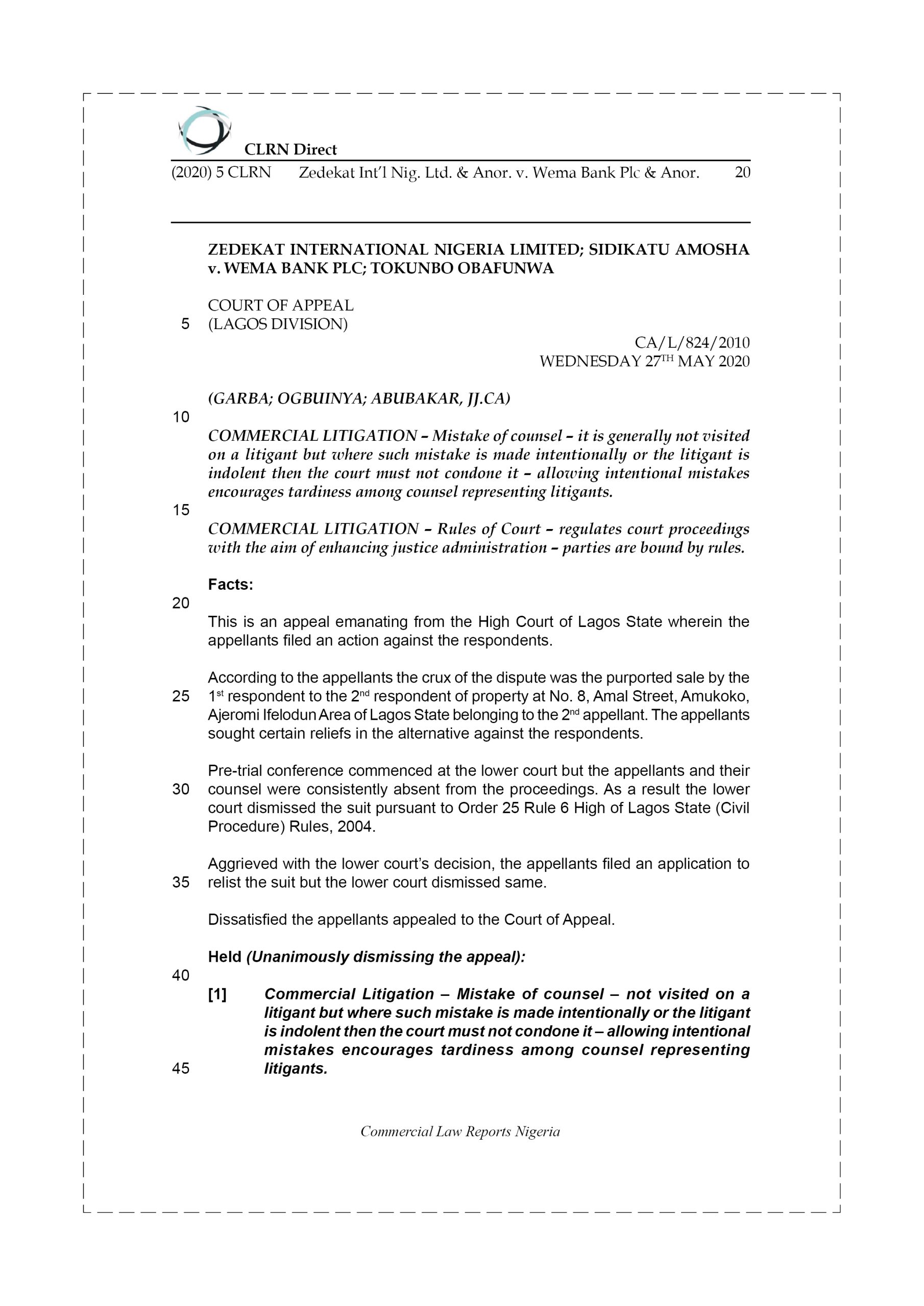ZEDEKAT INT’L NIG. LTD. & ANOR. v. WEMA BANK PLC & ANOR.